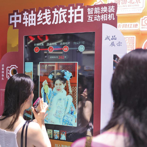 2025北京国际文旅消费博览会于6月20日至22日在北京展览馆举办。图为6月20日,北京文旅展位,观众使用中轴线旅拍“神器”。 新京报记者 李木易 摄