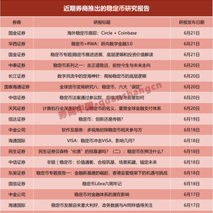 根据券商中国记者不完全统计,仅过去一周(6月15日至6月21日),就有至少16家券商发布24篇研报全面研究稳定币,内容覆盖宏观、计算机、传媒互联网、金融、区块链等多个行业角度。其中不乏一些券商推出稳定币专题及深度研究,比如国金证券、中泰证券、东吴证券、天风证券均推出稳定币专题或深度研究,中信证券宏观、海外、银行、非银等多个研究团队从各个行业角度深入研究。