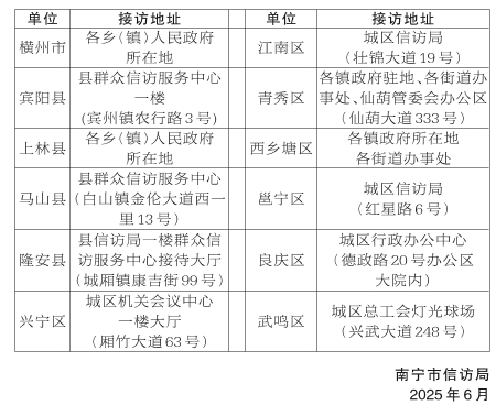 市委、市人民政府决定,于2025年6月25日(星期三)上午8时30分至12时,在各县(市、区)、市委和市级国家机关各部委办局、各开发区、各人民团体、市级各双管单位、市直各事业单位开展2025年第二季度“公开大接访”活动,欢迎群众前往反映问题,提出建议和意见。各县(市、区)接待地点见下表: