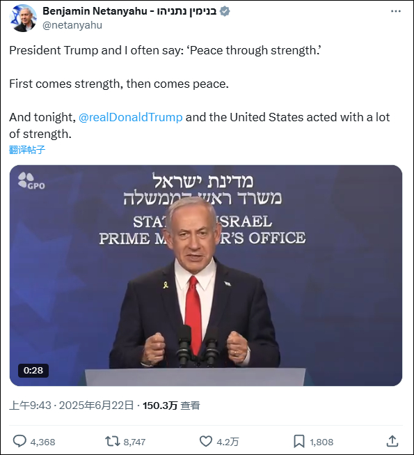 “我们已经非常成功地完成了对伊朗三处核设施的攻击,包括福尔道、纳坦兹和伊斯法罕。所有飞机现在都在伊朗领空之外。满载的重磅炸弹落在了主要设施福尔道。所有的飞机都在安全返回的路上。祝贺我们伟大的美国战士们。世界上没有其他军队能做到这一点。现在是和平的时候了!感谢您对此事的关注。”