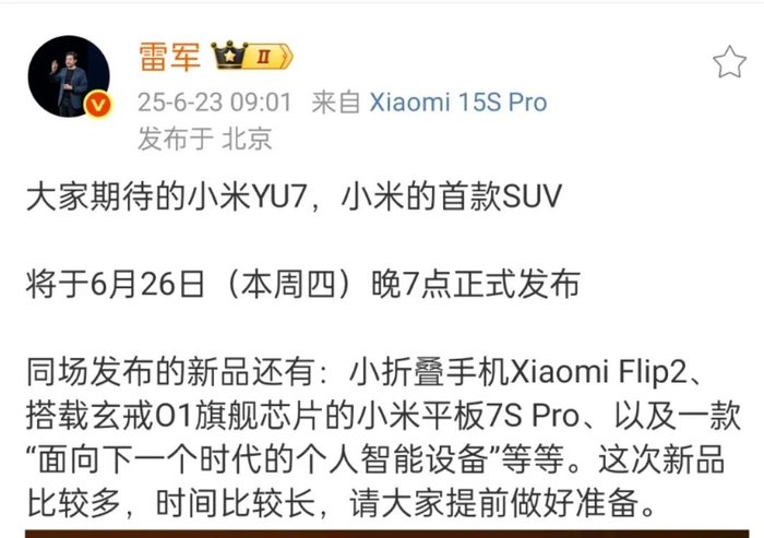 6月23日,雷军发文,大家期待的小米YU7,小米的首款SUV。