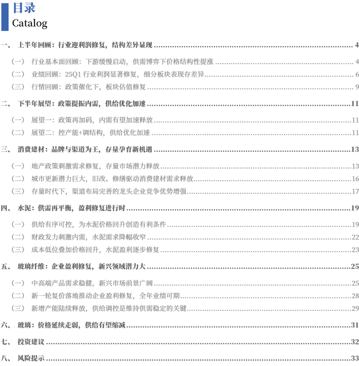 下半年展望:政策提振内需,供给优化加速。我们认为当前建材行业已经出现积极变化,2025年下半年有望在政策助力以及供给调控深化的背景下,迎来行业供需格局改善的新发展契机。一方面,国内政策调控力度有望在美国关税影响下再加码,加速内需释放;另一方面,行业供给侧将进一步加强调控力度,主要产品产量将继续缩减,加速行业落后产能淘汰。在此背景下,建材行业相关企业将迎来估值重构的机遇。