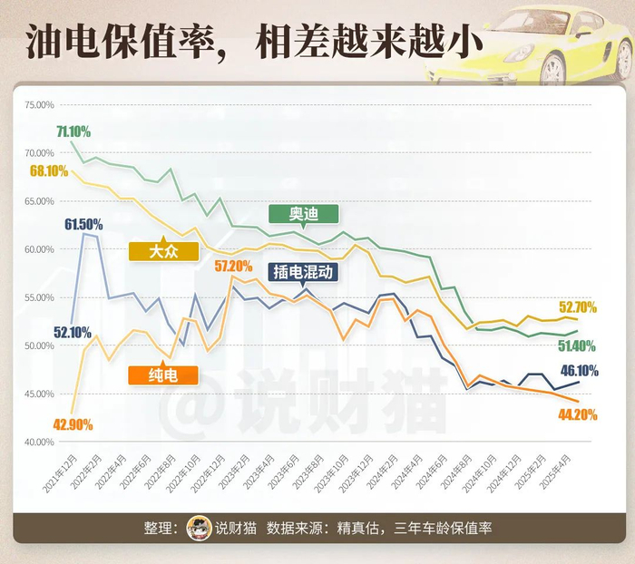我们以大众、奥迪这些仍以油车为主的品牌可以看,这3年的保值率都在不断下滑。