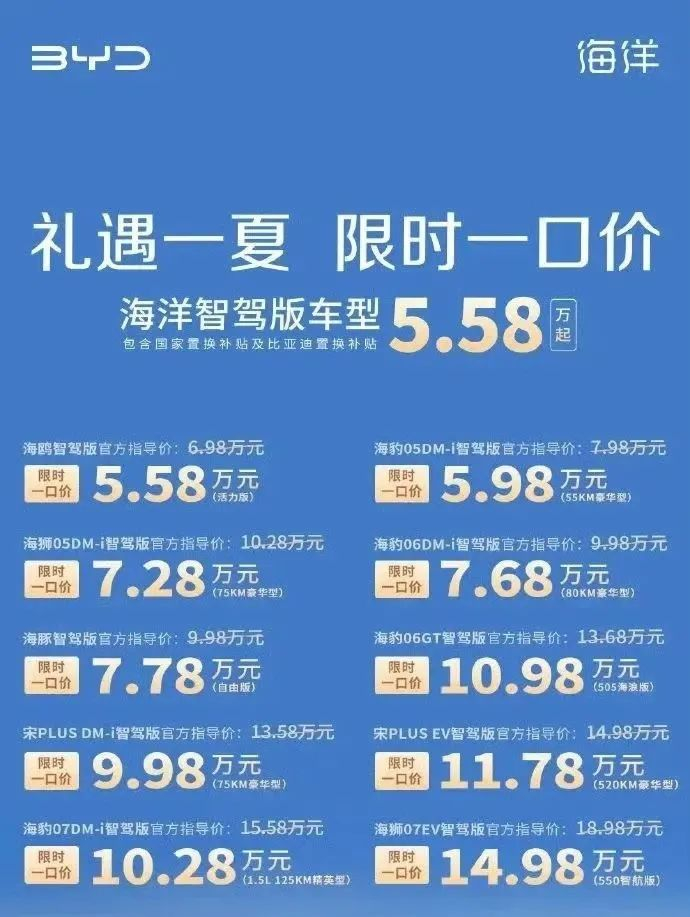 不用6万,就可以买比亚迪海鸥、海豹车系,普遍降价2-4万。