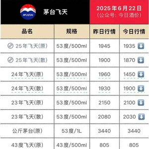 6月22日,“今日酒价”公众号披露的批发参考价显示,25年飞天茅台(53度/500ml,下同)原箱报1935元/瓶,较上一日下跌10元,散瓶价1870元/瓶,较上一日下跌30元; 24年飞天茅台原箱报1450(记者注,或应是1950)元/瓶,较上一日下跌510(10)元,散瓶价1900元/瓶,较上一日下跌30元;23年飞天茅台原箱报2100元/瓶,较上一日下跌50元,散瓶价2030元/瓶,较上一日下跌50元。