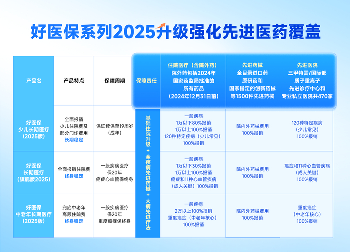 在先进医院的广覆盖上,“好医保”系列针对不同人群的特定疾病,首次将全国470家先进医院纳入保障范围,这470家先进医院包含了全国知名三甲医院的特需部、国际部,以及部分私立医疗机构,例如协和医院国际部、中日友好医院国际部等,并扩展了10家质子重离子先进诊疗中心,大大提升了特定关键疾病就医体验、效率和前沿疗法的可及性。
