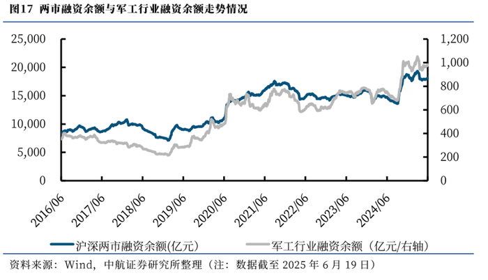 截至2025年6月19日,军工行业的融资余额合计976.35亿元,比上周环比上涨0.59%,占两市融资余额比例为5.41%。