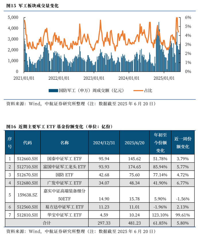 本周,军工板块(申万)成交额为2673.94亿元(+9.39%);占中证全指成交额比例为4.54%,同比上升0.81pts。主要军工ETF基金份额环比上周上涨5.80%。