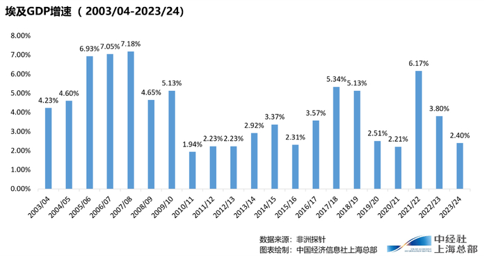 埃及经济面临长期结构性问题,近两年经济增速明显放缓。2023/24财年(2023年7月至2024年6月)埃及国内生产总值(GDP)增长率仅为2.4%。埃及央行(CBE)称,埃及经济经历了两年的“低迷”,2024/25财年以来,埃及经济逐步实现反弹。埃及规划、经济发展和国际合作部数据显示,2024/25财年第二季度(2024年第四季度)埃及GDP增长率至4.3%。