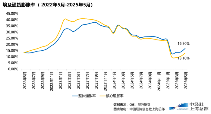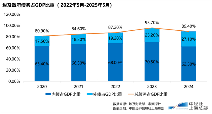 通胀和债务压力是“软肋”。高通胀是埃及经济面临的主要挑战之一。2024年埃及年均整体通胀率高达28.46%,年均核心通胀率高达27.43%。自2024年以来,埃及央行通过利率调控机制、汇率制度改革等货币政策“组合拳”,抑制通胀取得明显成效,埃及通胀一度实现12个月“连降”。不过,2025年2月开始,埃及整体通胀同比增速降至12.84%的阶段性低点后,通胀开始反弹。5月份,埃及整体通胀率连续3个月上涨至16.80%。