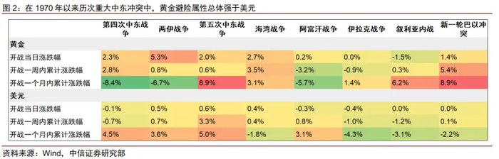 对大类资产而言,中东局势或难以迅速降温,短期上各类资产可能重复对突发事件的本能反应,后续推演则高度依赖情景假设。中信证券复盘了1970年以来中东地区八场重大冲突的市场影响,可总结为以下规律:避险资产黄金较美元更优,油价长期仍看供需,美股表现与美国军事介入程度和战局走势直接相关,而对中国资产并无显著影响。