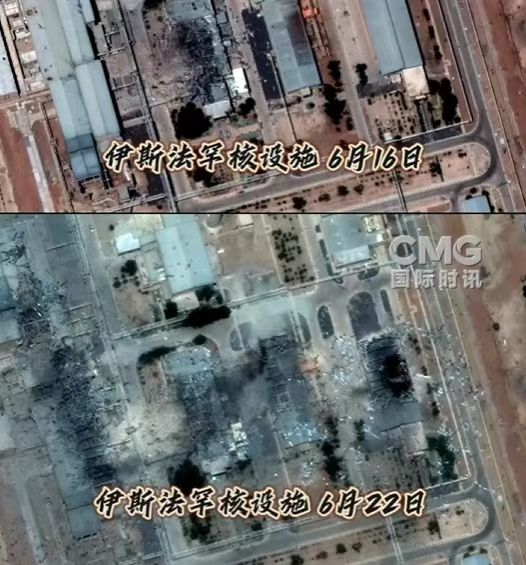 通过一组卫星图像来看,其中的伊斯法罕和纳坦兹这两处核设施遭袭后地面建筑有一定程度损毁。