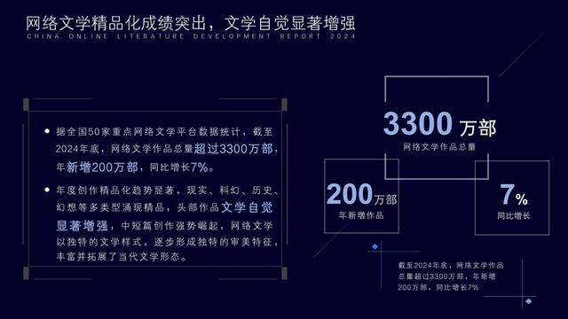▷中国网络文学用户规模达5.75亿人。据中国作家协会近日发布的《2024中国网络文学蓝皮书》显示,我国网络文学用户规模达5.75亿人。核心阅读群体为26至45岁读者,约占全部读者的50%;“00后”读者占比近25%。截至2024年底,网络文学作品总量超过3300万部,年新增200万部,同比增长7%。据全国50家重点网络文学平台数据统计,2024年网络文学营收规模约440亿元。网络文学正丰富并拓展着当代文学形态。