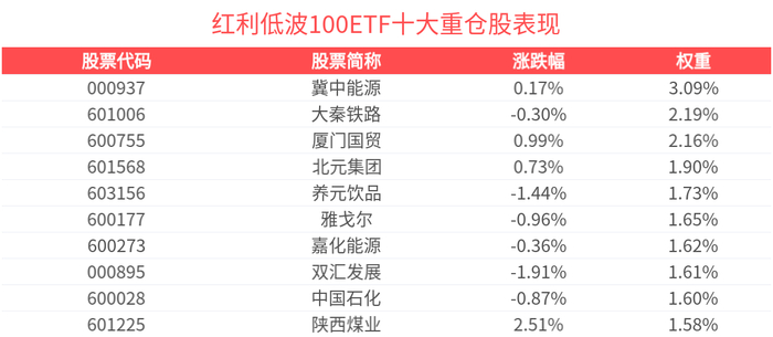 数据显示,截至2025年5月30日,中证红利低波动100指数(930955)前十大权重股分别为冀中能源(000937)、大秦铁路(601006)、厦门国贸(600755)、北元集团(601568)、养元饮品(603156)、陕西煤业(601225)、嘉化能源(600273)、中国石化(600028)、雅戈尔(600177)、中国神华(601088),前十大权重股合计占比19.64%。