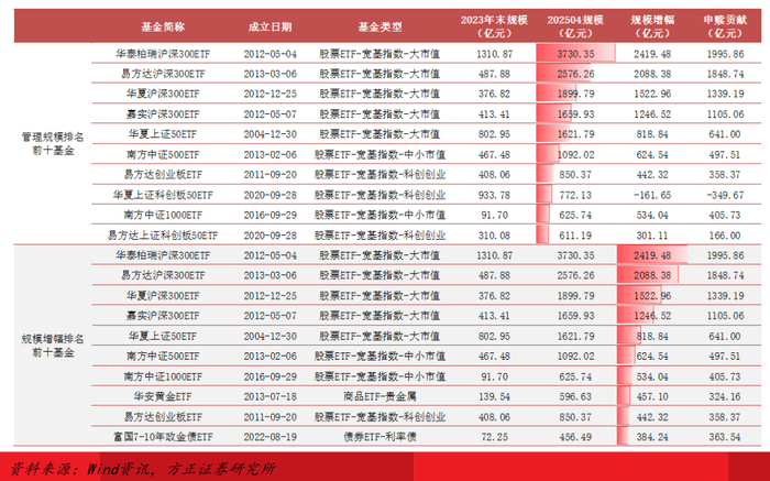 最新规模:截至2025年4月末,规模排名前十的ETF基金均为宽基ETF,跟踪指数覆盖沪深300、上证50、中证500、中证1000、创业板指和科创50;四大300ETF及华夏50ETF、南方500ETF最新规模均超千亿元。