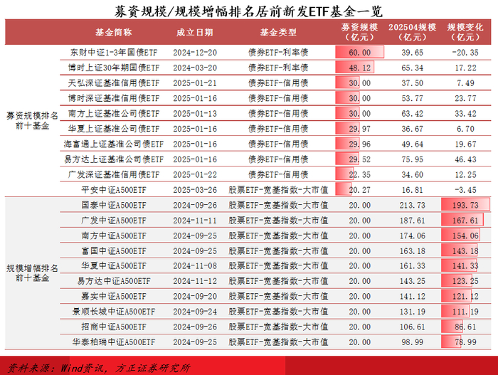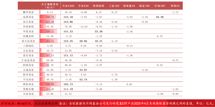 规模变化:规模增幅排名前十的ETF基金全部为中证A500ETF,国泰、广发、南方等8家公司旗下产品规模增幅超100亿元,各家基金公司投入大量资源进行持续营销成效显著。