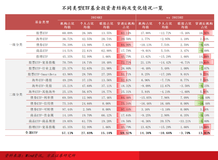 同比变化:相较于2023H2,机构对股票/海外/指增ETF的配置占比均有提升,宽基ETF配置占比增幅高达19.64%,SmartBeta/港股ETF机构占比双双升至50%以上;个人投资者对利率债/信用债/贵金属ETF的配置占比均显著提升,增幅均在10%左右。