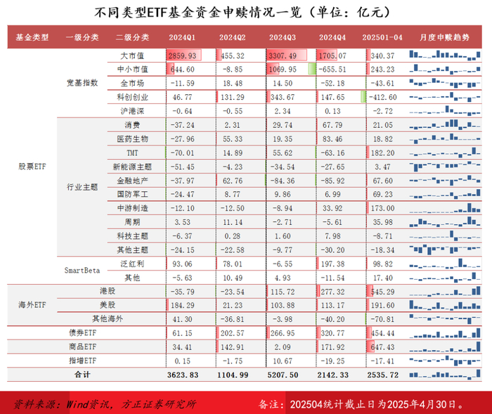 截至2025年4月末,全市场1130只非货ETF合计规模38908.11亿元,较2023年末增长20396.34亿元;产品发行/资金申赎/净值增长带来的规模增量贡献分别为2154.62亿元、14614.37亿元和1486.33亿元。大市值/中小市值宽基板块净流入规模分别为8668.17亿元和1293.41亿元,合计占比近七成;泛红利ETF、港股ETF、美股ETF、债券ETF和商品ETF五类风险收益特征与A股弱相关资产同样获得较高规模资金净流入。