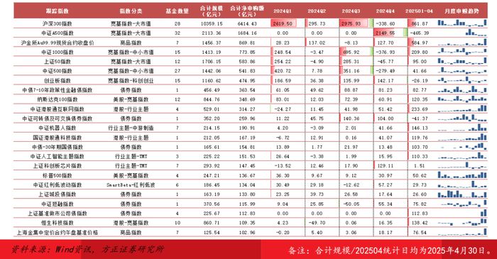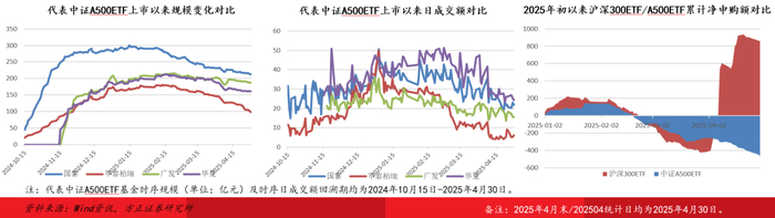资金申赎:2024年1月-2025年4月,沪深300ETF净申购额遥遥领先,28只标的合计净申购额超6400亿元;重磅创新产品中证A500ETF24Q4单季净申购额超2100亿元,同期沪深300ETF净流出338.60亿元,市场资金在两类产品之间进行了一定切换腾挪,但在2025年2月之后,A500ETF规模持续下滑,4月净流出215.89亿元,同期沪深300ETF净流入超1200亿元。