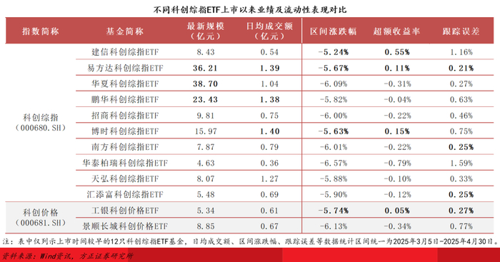 市场现有16只科创综指ETF的跟踪指数存在细微差别,12只产品跟踪科创综合指数(000680),4只产品跟踪科创综合价格指数(000681),前者收益略高于后者,中长期可积累起一定超额收益。此外,前一指数的市场认知度高于后者,若投资者以“科创综指”为关键词搜索指数信息及对应ETF产品,可能会遗漏部分跟踪科创价格指数的ETF产品。