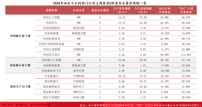 新发行业主题ETF基金对应跟踪指数主要集中在三个方向:科创板行业主题指数、创业板行业主题指数、新质生产力主题指数,其中跟踪科创人工智能/科创芯片/创业板人工智能/中证机器人/国证通用航空指数的新发产品数量较多,产品上市后均实现不同幅度规模增长。以上指数契合当下热门的AI大模型、人型机器人、低空经济等投资主题,“924”行情以来表现十分突出,极大激发了基金公司的产品布局意愿及市场资金的投资热情。