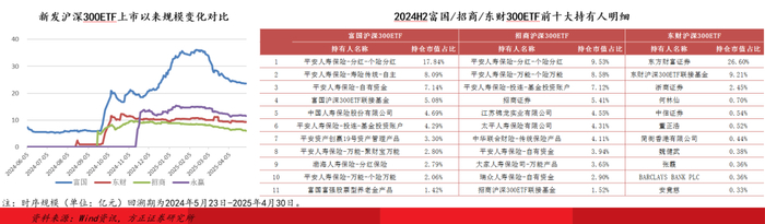 2024年,富国、东财、招商、永赢4家公司新发行沪深300ETF,4只产品上市后均实现规模增长,其中富国沪深300ETF规模增长最为显著,4月末规模达23.56亿元,较首发募资规模(7.17亿元)增长16.40亿元。除营销资源的投入外,富国基金良好的机构客户基础也为产品规模增长提供了有力条件,2024年报披露的基金前十大持有人中,除联接基金及富国旗下养老金产品外,其余重仓持有人均为保险机构资金,合计披露持仓市值高达53.00%。