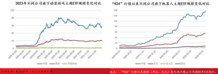 与之类似,“924”行情以来,人型机器人主题表现亮眼,相关主题产品中,华夏中证机器人ETF2025年4月末规模高达136.86亿元,较行情启动前增长了127.16亿元,规模增幅远高于其他同类产品。