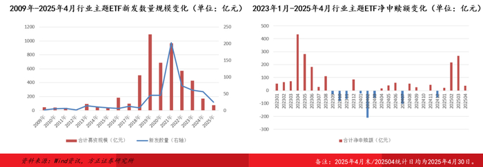 2022年之后行业主题ETF发行节奏大幅放缓。2024年/2025年1-4月,全市场新发行业主题ETF基金56只/25只,合计募资168.60亿元/75.80亿元。与此同时,受股市行情持续不振的影响,行业主题ETF资金净流入规模偏低。2023年以来累计净申购额1473.60亿元,远远低于同期宽基指数ETF的净申购额13355.19亿元。