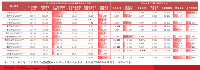2024年末,南方/华夏/华泰柏瑞A500ETF第一大重仓机构为券商(非投资),而富国/景顺长城/摩根A500ETF重仓机构则为保险公司;景顺长城和银华A500ETF前十大持有人包括同公司旗下的资管计划。