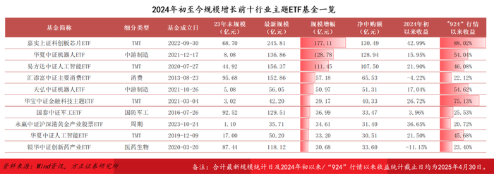 2024年初以来规模增长排名居前的行业主题ETF基金也大多投资于以上热门主题方向,嘉实科创芯片ETF、华夏机器人ETF、易方达人工智能ETF规模增幅及净申购额均超百亿元,产品亮眼的业绩表现吸引市场资金积极申购,带动产品规模快速增长。