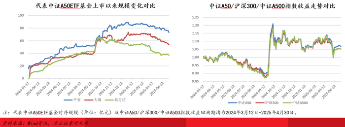 平安/大成/易方达旗下中证A50ETF规模领先,2025年4月末规模分别为73.29亿元/53.73亿元/36.97亿元;产品规模先升后降,在突破80亿元/60亿元门槛后出现一定回撤,规模增长触及瓶颈。