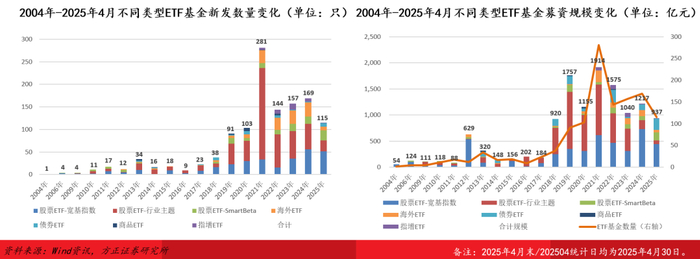 产品发行:2024年/2025年1-4月全市场ETF基金新发数量169只/115只,合计募资1217.31亿元/937.31亿元,在公募基金整体发行热度持续低迷的背景下,保持了2019年以来的独立高景气度。