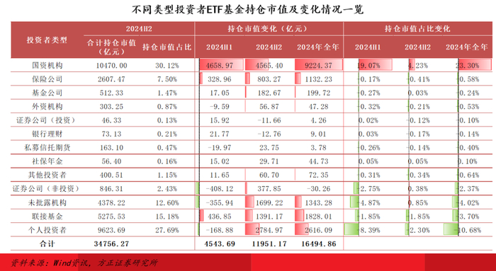 增量资金:2024H2,国资机构披露持仓规模高达10470.00亿元,较2023H2增加9224.37亿元,远超其他机构;保险公司披露持仓市值2607.47亿元,增加1132.23亿元,另有联接基金和个人投资者持仓市值分别增加1828.01亿元和2616.09亿元,以上几类投资者是2024年以来ETF市场规模增长的主要增量资金来源。