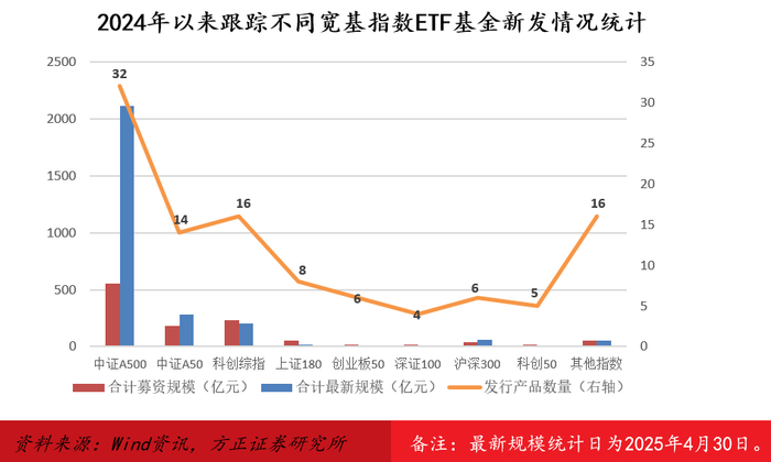 1)中证A500/中证A50/科创综指:2024年以来新推出重磅创新宽基指数,各家基金公司积极参与布局,对应新发ETF基金数量32只/14只/16只,平均募资规模17.31亿元/13.17亿元/14.51亿元,两项数据均远多于其他宽基指数。