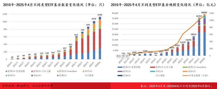 市场变化:截至2025年4月末,全市场1130只非货ETF合计规模38908.11亿元,较2023年末增长20396.34亿元,规模增幅高达110.18%,实现翻倍增长;