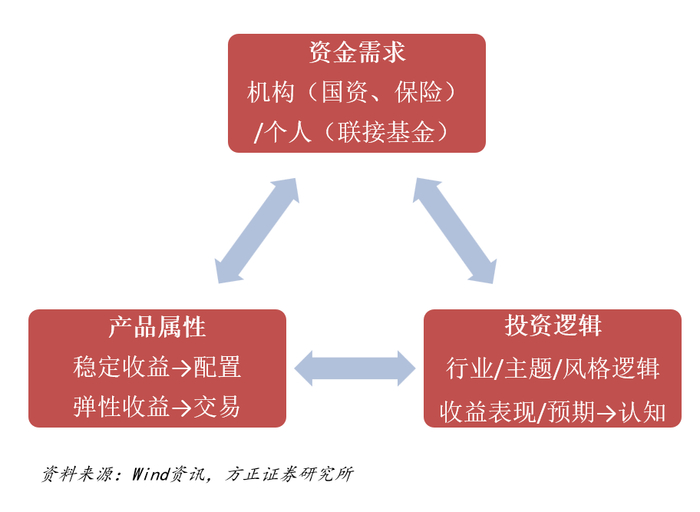 产品属性:不同属性资金风险偏好及投资策略存在差异,对应适配的投资工具各不相同。机构偏好稳定收益特征的配置工具,以沪深300ETF为代表的宽基标的最受青睐;个人更偏好高弹性特征的交易工具,行业ETF成为投资首选。