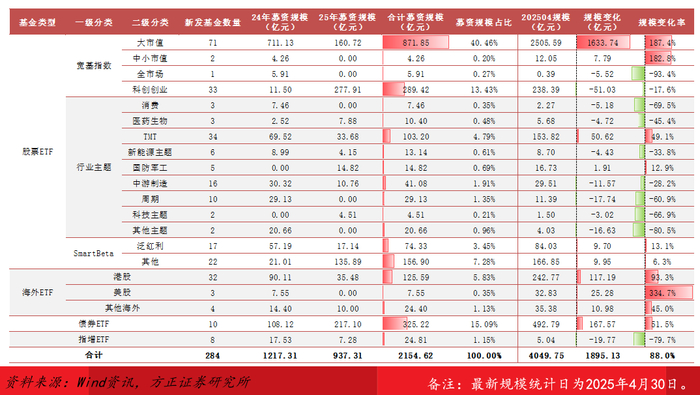 产品发行:2024年1月-2025年4月,全市场新发宽基指数ETF基金107只,合计募资1171.44亿元,覆盖18只跟踪指数。