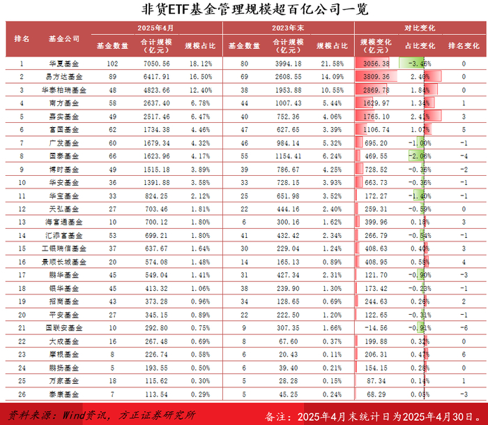 市场格局:截至2025年4月末,26家公司ETF基金管理规模超百亿元,较2023年末新增加5家(大成、摩根、鹏扬、万家、泰康);华夏基金管理规模超7000亿元,稳居行业第一,但市占率较之前大幅下滑3.46%,与易方达间的规模差距从2023年末的近1400亿元收窄至600余亿元。另有华泰柏瑞、南方等8家公司管理规模超千亿元。CR5、CR10最新水平为60.26%/80.68%,较2023年末水平增长2.36%/1.70%。