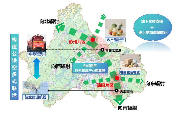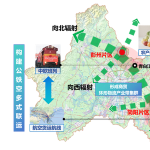枢纽选址于彭州农副产品及食品专业物流港(彭州片区)和简阳临空经济产业园电商智慧物流区(简阳片区),形成“陆港+空港”双核驱动的发展格局,总规划面积为8.59平方公里。两片区将通过产业功能互补、线上线下融合、通道立体联动、商贸环形产业带集群构建等方式实现深度融合,共同服务国家综合型现代流通战略支点城市、国家战略腹地核心承载区等重要战略部署。枢纽建设布局功能性设施项目38个,其中存量项目23个,增量项目15个,计划总投资369.34亿元,目前已完成投资244.53亿元。