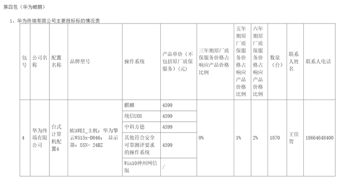 第四包(华为鲲鹏):由华为终端有限公司中标,中标金额为860.013万元。