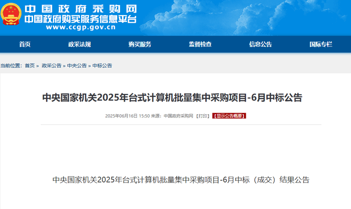 近日,中央国家机关政府采购中心发布了2025年台式计算机批量集中采购项目-6月的中标公告。此次采购项目预算金额为3784万元,涵盖了多种芯片架构的台式计算机,包括国产芯片和国际主流芯片。