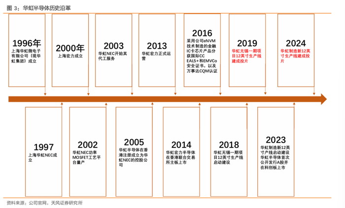 大陆特色工艺晶圆代工龙头,战略地位清晰。华虹半导体的历史可以追溯到1997 年成立的华虹NEC,2005年华虹半导体在香港注册成立为华虹NEC的控股公司,上海宏力于2000年设立,2002年华虹NEC开始量产MOSFET工艺平台,2014年,华虹半导体在香港联合交易所主板上市,公司无锡一期12英寸生产线于2018年启动建设并于2019年建成投片。华虹制造新12 英寸生产线于2023年启动建设并于2024年建成投片。目前,公司已发展为全球领先的特色工艺纯晶圆代工企业,专注于嵌入式/独立式非易失性存储器、功率器件、模拟与电源管理和逻辑与射频等特色工艺技术的持续创新,产品广泛应用于新能源汽车、绿色能源、物联网等新兴领域。其质量管理体系严格,满足汽车电子芯片生产的严苛要求。