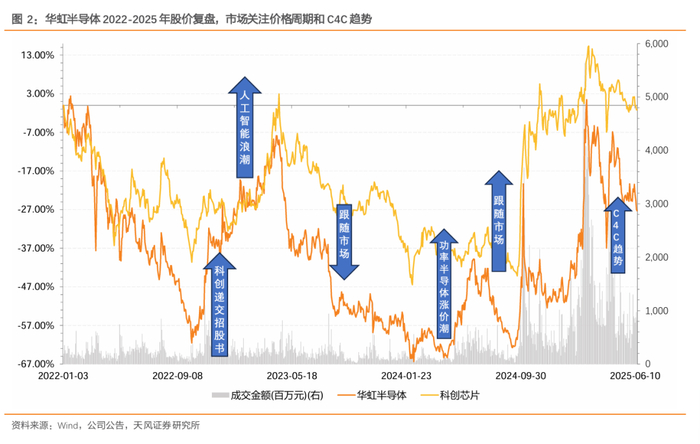 我们复盘了华虹半导体的历史股价表现,认为公司股价对盈利水平/C4C 趋势等因素较为敏感。2020-2021年间,半导体行业景气度上行,公司股价对盈利水平较为敏感。2022年至今,公司股价基本跟随科创芯片指数运行,市场关注价格周期和需求端的China for China(C4C)趋势。
