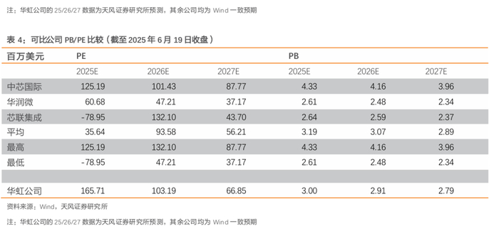 华虹公司作为重资产科技公司,盈利水平受折旧影响较大,短期利润不能充分反映公司价值,公司更适合采用PB估值,同时考虑盈利水平周期波动以及新厂扩建对远期盈利规模的带动。我们预计公司25/26/27年营收达到172/204/244亿元,归母净利润达到8.01/12.86/19.85亿元,选取晶圆代工企业中芯国际/华润微/芯联集成作为对标公司,2025年平均pb为3.19,考虑到华虹公司作为大陆特色工艺晶圆代工龙头的技术领先性,我们保守给华虹公司A股2025年3.0xPB估值,对应目标价76.88元,首次覆盖给予“买入”评级。