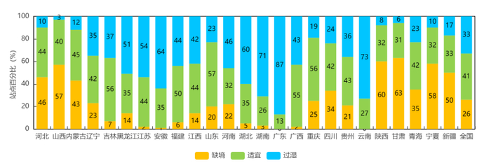 附图2 6月22日分省20厘米土壤墒情统计(站点百分比)
