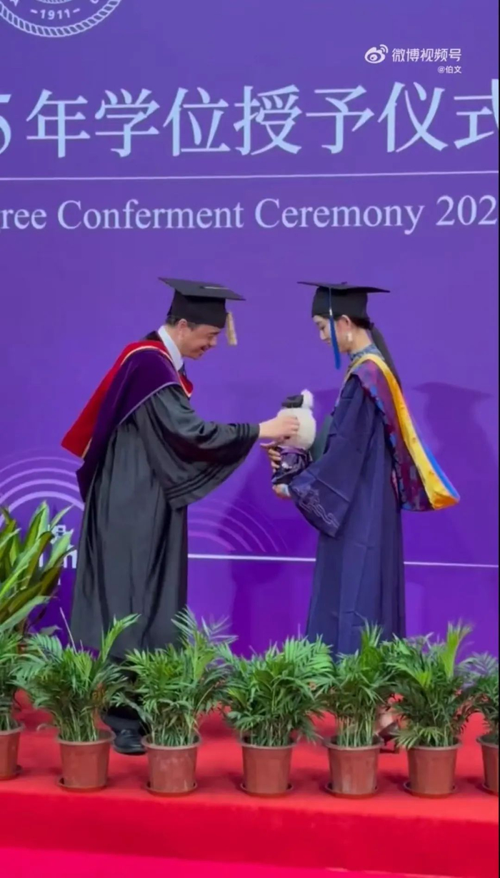 6月22日,在清华大学的毕业典礼上,一学生携带同样身穿学士服的Labubu玩偶上台,想与Labubu一同“拨穗”,随后副校长配合完成仪式,合影时他还询问:“这是不是最近很火的Labubu?”