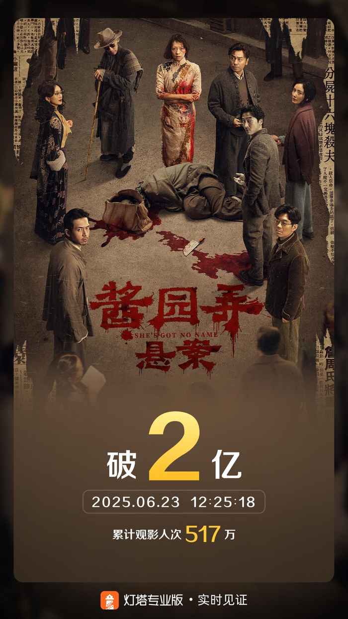 据灯塔专业版实时数据,截至6月23日12时25分,影片《酱园弄·悬案》票房突破2亿元。