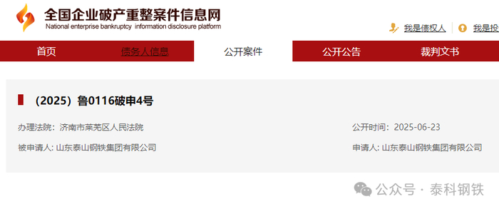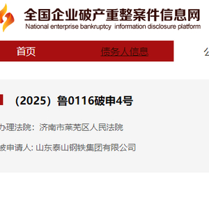 2025年6月23日,全国企业破产重整案件信息网公开(2025)鲁0116破申4号破产审查案件。其中,申请人与被申请人均为山东泰山钢铁集团有限公司,受理法院为济南市莱芜区人民法院。
