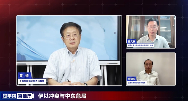 观察者网《观学院直播厅》第九期邀请上海外国语大学杰出教授黄靖,宁夏大学阿拉伯学院院长、中国中东学会副会长李绍先,中国人民大学区域国别研究院中东研究所所长、教授田文林进行对话,解读当前的伊以冲突局势。以下为文字稿下篇,上篇见链接。