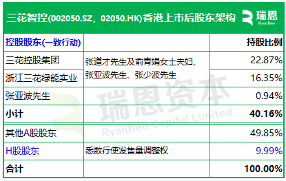 招股书显示,三花智控在香港上市后的股东架构中,张道才先生、俞青娟女士、张亚波先生(直接持股1.05%)、张少波先生,通过若干中间实体,合共持股约40.16%,为控股股东。* 张道才先生为张亚波先生、张少波先生的父亲,他们为一致性行动人,俞青娟女士为张道才的配偶。